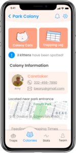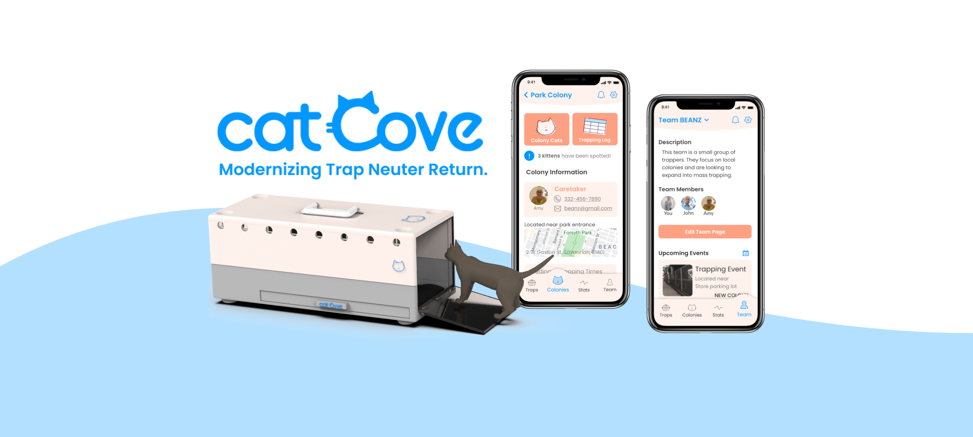 The mobile app automates tracking, logging, trapping, and organizing with TNR groups. The catCove app wirelessly connects to the partner trap or trap attachment that the caretaker has. This allows the trap to notify the caretaker of any cats that are identified and if they are in need of any special care. Additionally, any cats that are captured by the trap are automatically added to a log for that colony. Caretakers can also work with teams and assign catCove equipment to members through the app.